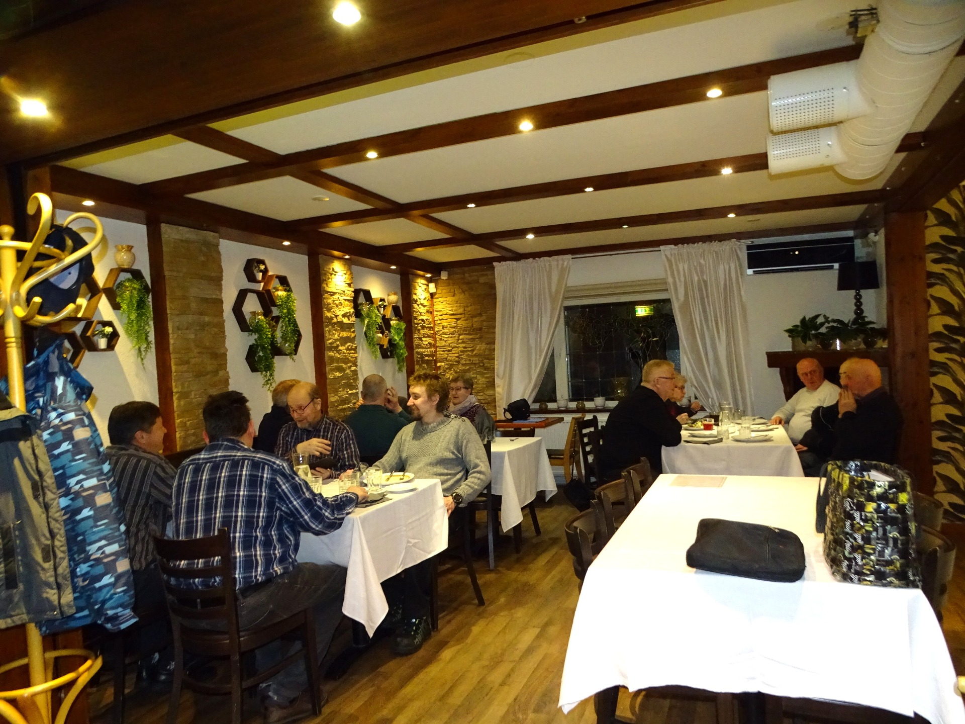 Hoitokalastuksen talkooporukka ruokailemassa Lounaskahvila Kurmeessa. Mukana myös kutsuvieraina Jari Sihvonen sekä toiminnanjohtaja Jukka Koski-Vähälä sekä suunnittelija Aku Korhonen Savo-Karjalan Vesiensuojelu- yhdistyksestä